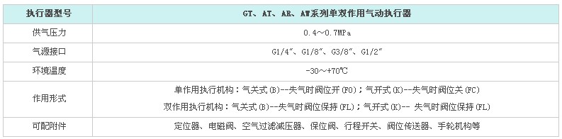 采用新型气动执行器,有双作用式和单作用式(弹簧复位),齿轮齿条传动,安全可靠;大口径阀门采用系列AW型气动执行器拔叉式传动,结构合理,输出力大,有双作用式和单作用式。